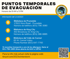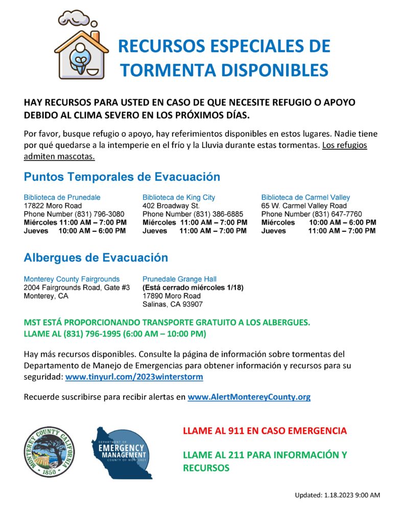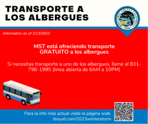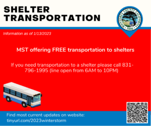 Monterey County residents who need transportation to Monterey County Shelter locations and Monterey County Temporary Evacuation Points during the current Winter Storm Event will be able to get rides through MST. Transportation includes support for Access and Functional Needs and/or paratransit.